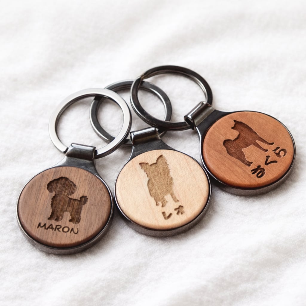 犬・猫 銘木 丸型 Key ring 天然木 キーホルダー