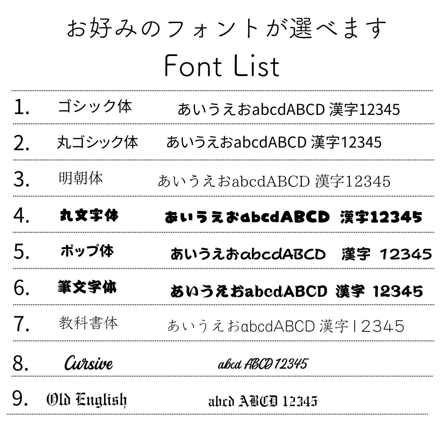 オプションをご希望の方は、必ず希望文字とフォント番号の記載をお願いいたします。フォント番号の指定がない場合は、全てゴシック体で製作させていただきますので、ご了承ください。