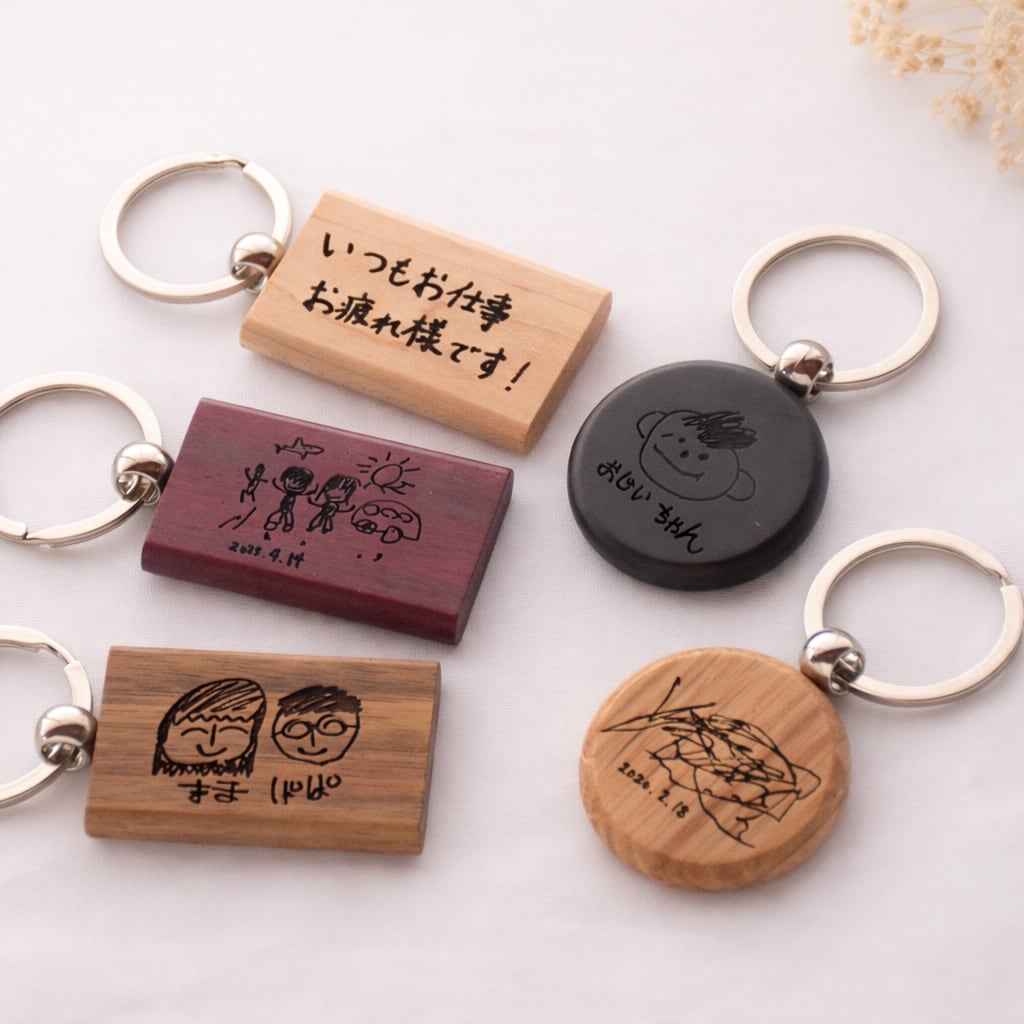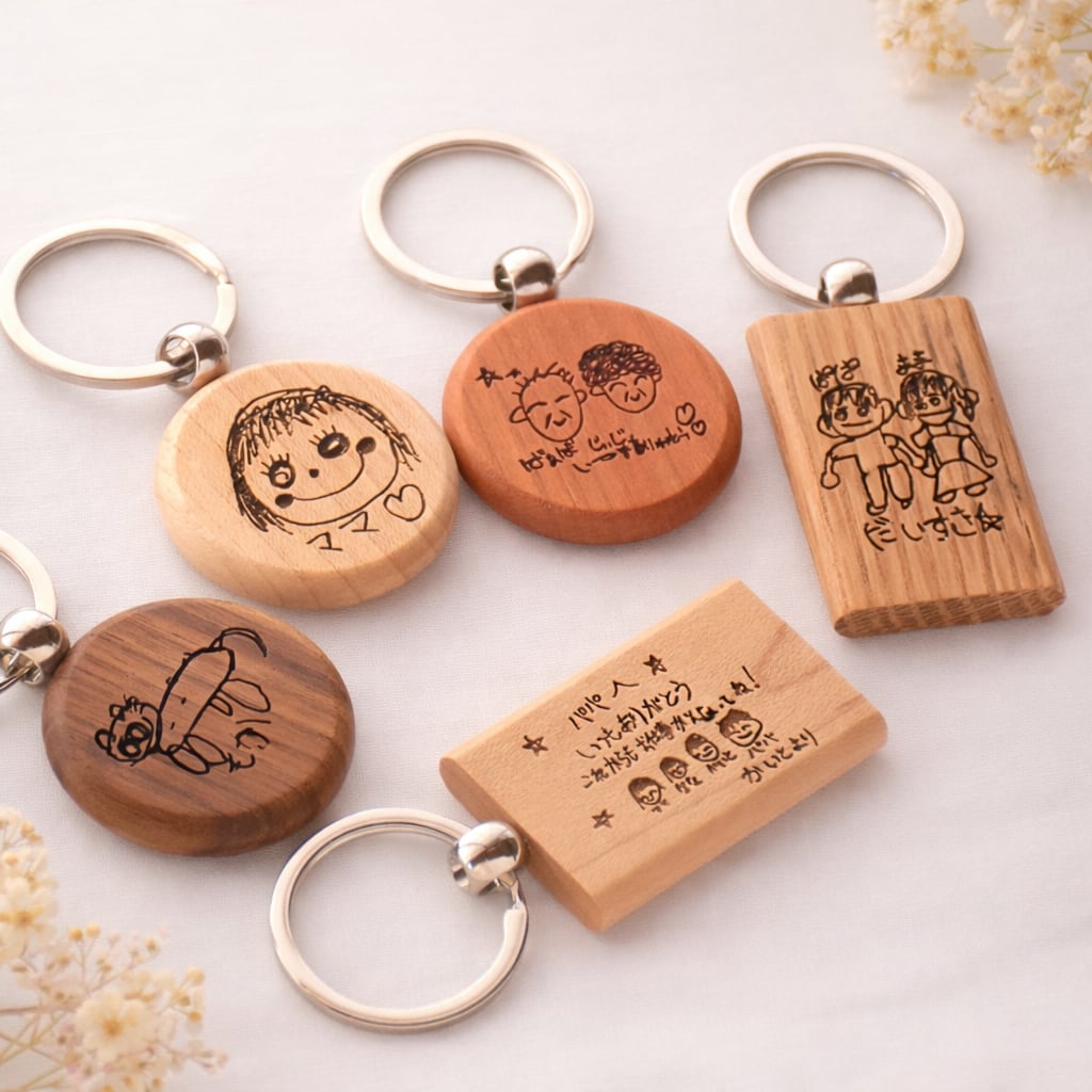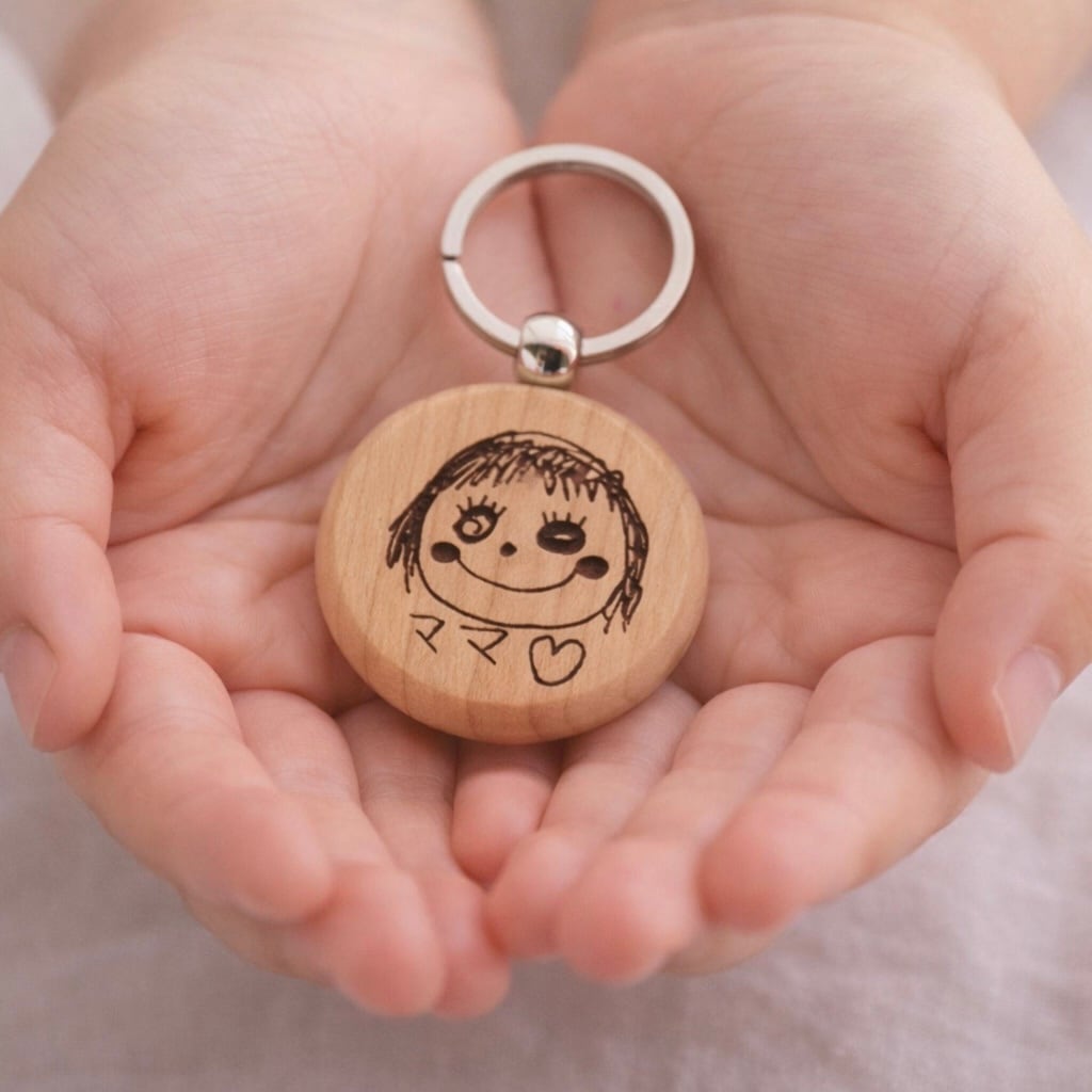 お子さまの絵、家族のイラスト、大切なメッセージ、紙に描いたそのままの手書きイラストを、木製キーホルダーにレーザー刻印します!